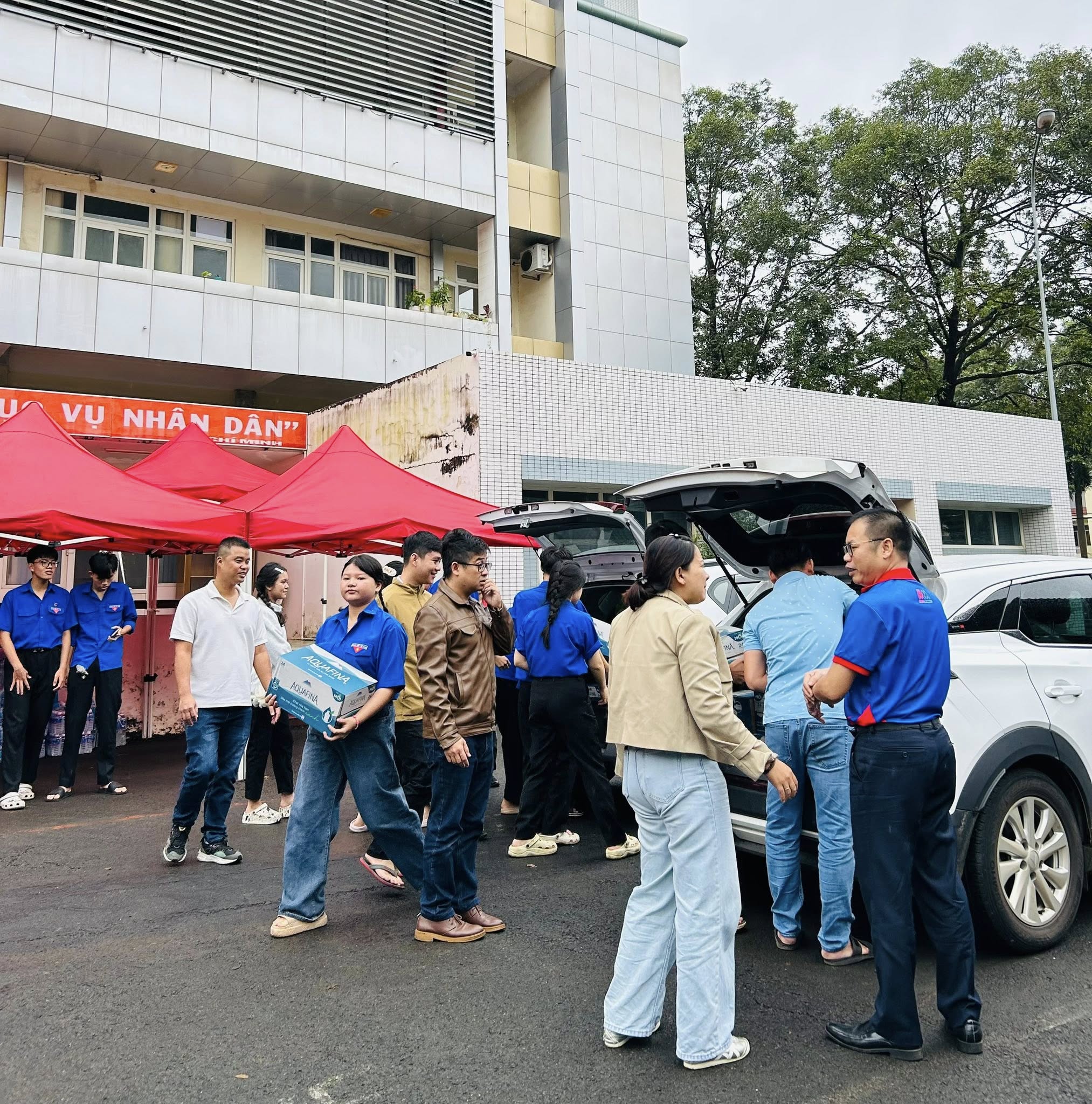 ✨ 50 essential relief packages, including bottled water, C’est Bon cakes, Three Girls canned fish, and sliced pork, were delivered and gathered at the Buôn Ma Thuột Ward People’s Committee.
